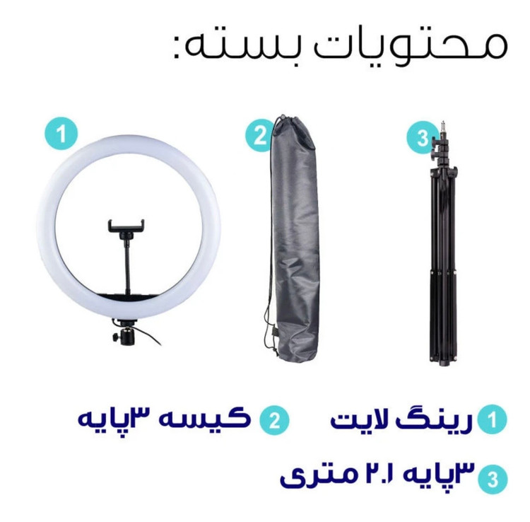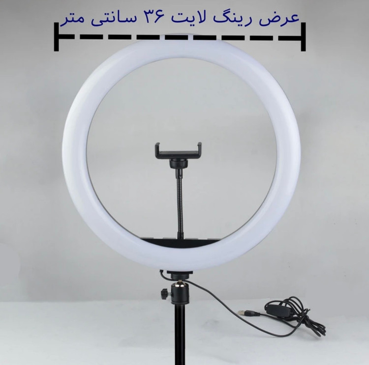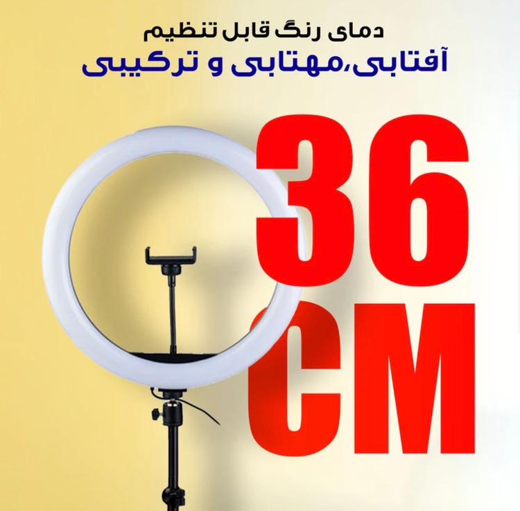 | ویژگی ها | قطر رینگ لایت:36 سانتی متر به همراه پایه 2.1 متری ،کیسه حمل پایه دما و شدت نور قابل تنظیم از 3200تا5600 کلوین (آفتابی،مهتابی و خنثی) و رنگ های RGB ، راه اندازی با یو اس بی دارای ریموت کنترل سیمی ، نگهدارنده منعطف گوشی |