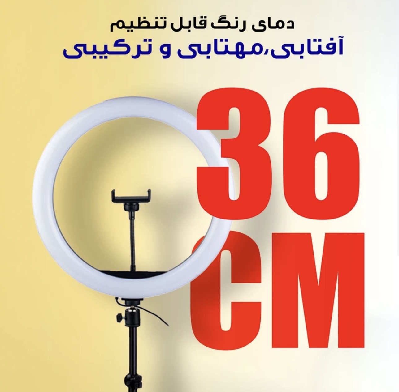 | ویژگی ها | قطر رینگ لایت:36 سانتی متر به همراه پایه 2.1 متری ،کیسه حمل پایه دما و شدت نور قابل تنظیم از 3200تا5600 کلوین (آفتابی،مهتابی و خنثی) و رنگ های RGB ، راه اندازی با یو اس بی دارای ریموت کنترل سیمی ، نگهدارنده منعطف گوشی |